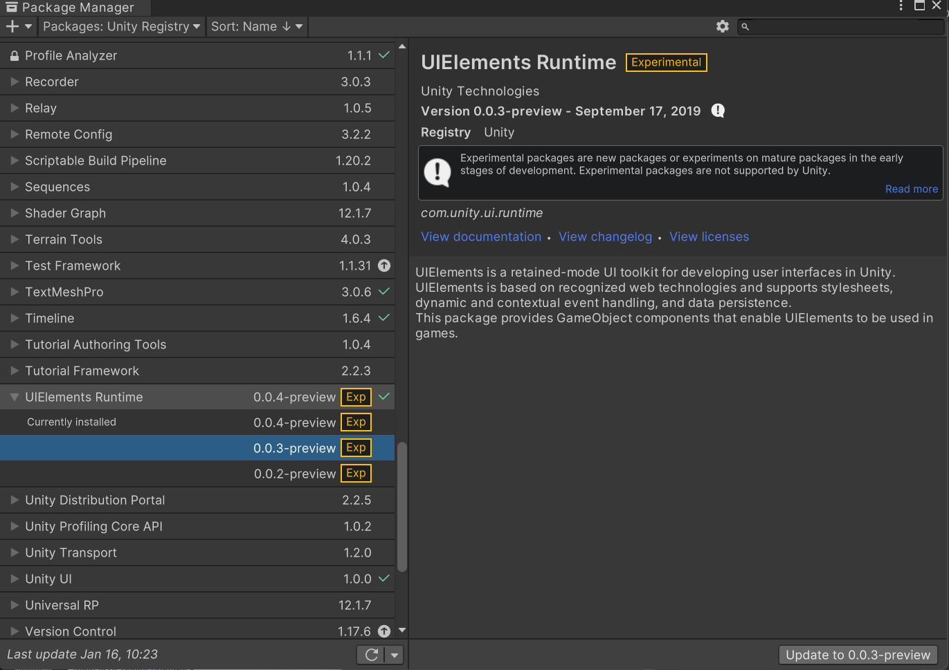 UIElements Runtime이 가장 최신 버전인 0.0.4로 다운되었으나 0.0.3버전 선택 > Update to 0.0.3-preview