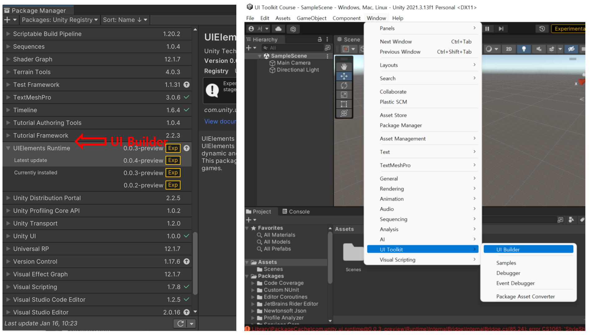 (이전 버전은 Package Manager 에 UI Builder 가 있었으나 현재는 빠져서 위의 형식으로 접근한다.)