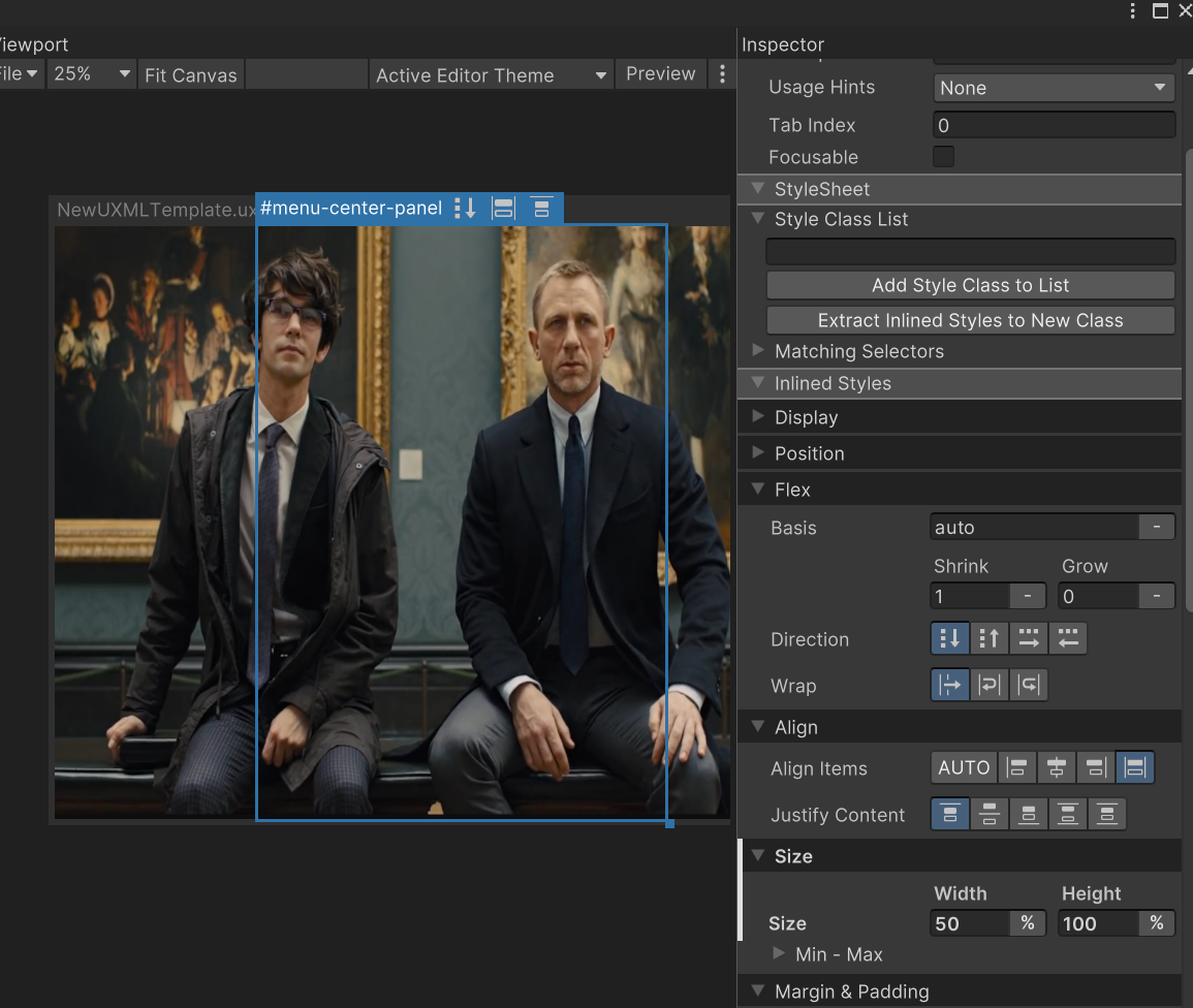 기존의 Button 삭제 > 하위 항목으로 VisualElement > (우클릭) Rename > menu-center-penal
