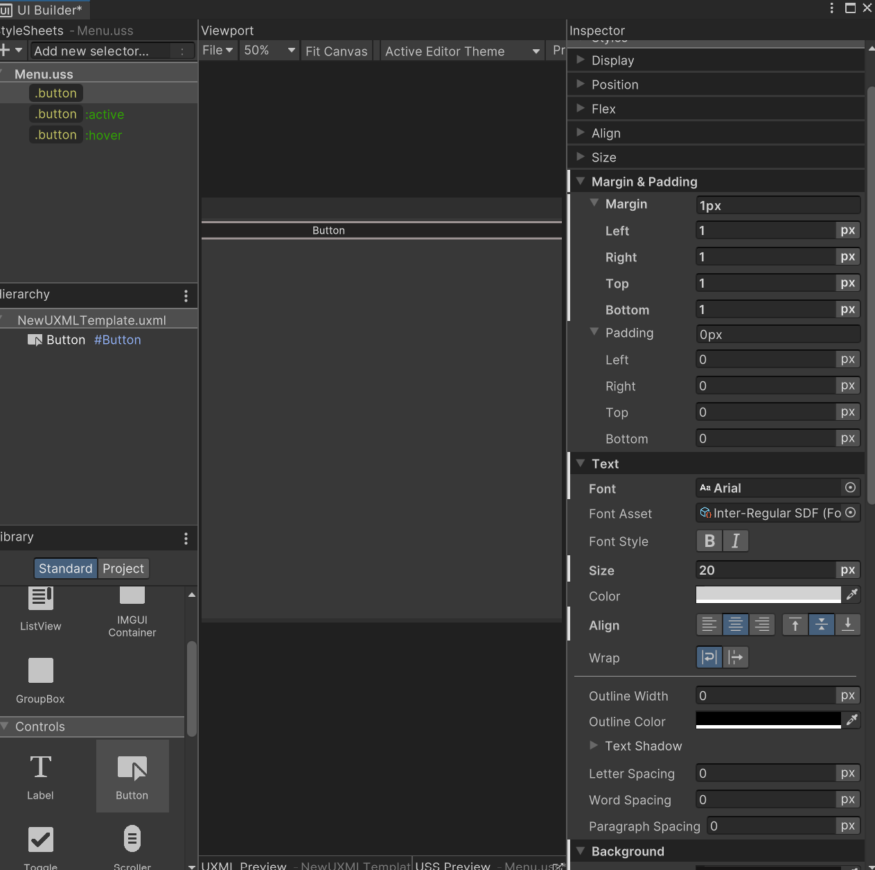 (좌측 Hierarchy) Button > (우측 Inspector) Style Class List > button 입력 > Extract Inlined Sytles to New Class > UI에 저장