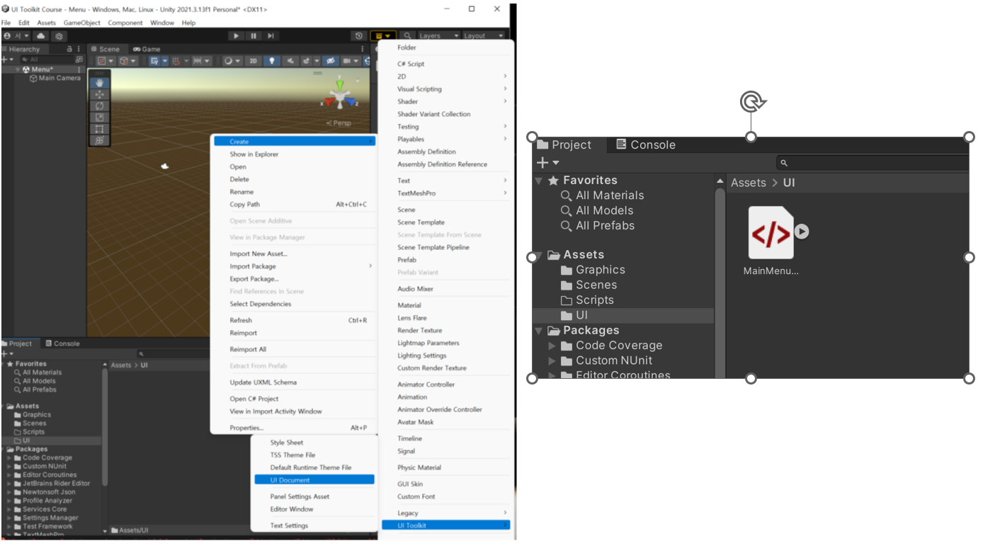 Assets > UI > (우클릭) Create > UI Toolkit > UI Document > MainMenuScreen으로 이름 설정