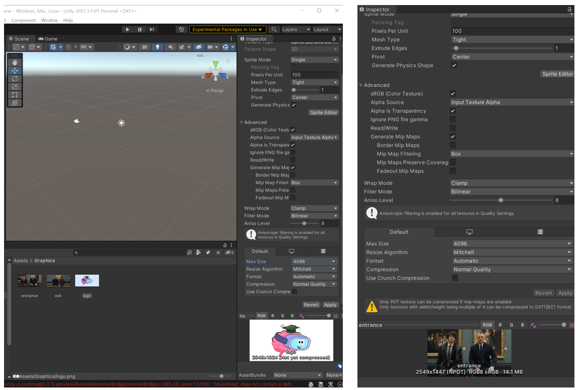 (각각의 사진들을 세팅) logo > Texture Type : Sprite (2D and UI) > Sprite Mode : 2D > Mesh Type : Tight > Generate Physics > sRGB {Color Texture} > Alpha is Trasparency > Generate Mip Maps > Wrap Mode : Clamp >Filter Mode > Bilinear > Max Size : 4096